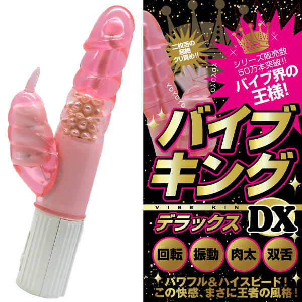 バイブ界のキングが降臨!パワフルさとハイスピード感で快感の頂点を目指す、大人気シリーズ新作の「バイブキングDX」。力強くかき回す回転機能&芯まで響く強力振動に加えて内蔵パールの刺激をプラス!肉感たっぷりな弾力のある三段ボディと2枚舌のクリバイブで快感の嵐を巻き起こす電池式バイブです。単三電池を3本使用、ピンクカラー