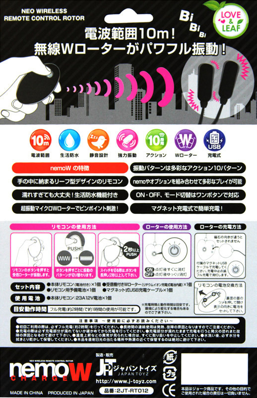 離れた場所にいてもイタズラし放題!大人の遊びを満喫できるリモコン型ツインローター(ブラック)。●USB充電式・便利なマグネットタイプ●受信機は2時間の充電で約1時間稼動●生活防水仕様&静音設計●強力小型ローター(2個入り)●約10m先まで遠隔操作可能●10パターンのパワフル振動を搭載。ビビビッ!と伝わる振動刺激が、優しく時には激しくアソコを責め立てます。恥ずかしさを忘れていつしか自分から求めるように…!S心もM心も疼かせるリモコングッズです。受信機は電波受信の為に振動時以外も電池を消費しますので、使用後は必ず電源をOFFにしてください。※付属電池は動作確認用です。