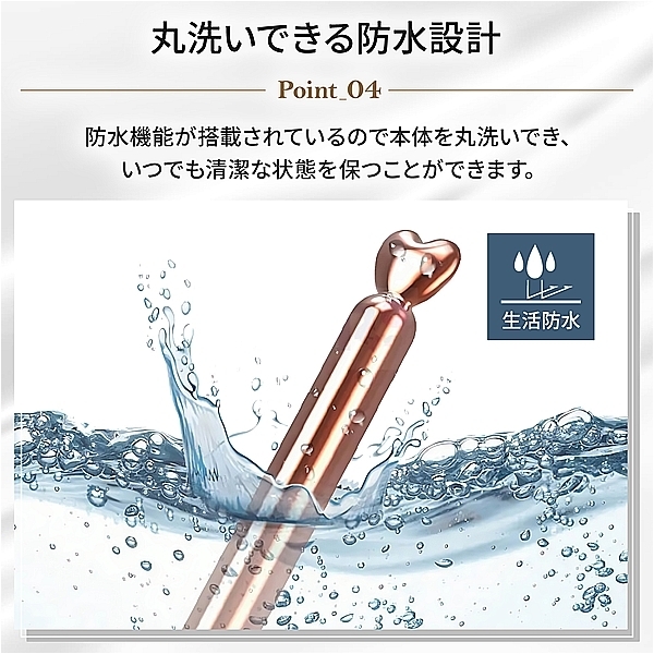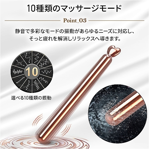 携帯に便利な手のひらサイズのスタイリッシュなマッサージャーが登場!10種の振動パターンでご自身のライフスタイルに合わせて使い分け。ハート型のキャップがとても可愛く印象的。健康とリラクゼーションを目的としたフェムケア用品となり女性でも安心してご利用いただけます。※充電の際は、ハート部分(キャップ)を少しだけ反時計回りに回し引っ張ると、充電の差込口があります。●カラー:ローズゴールド