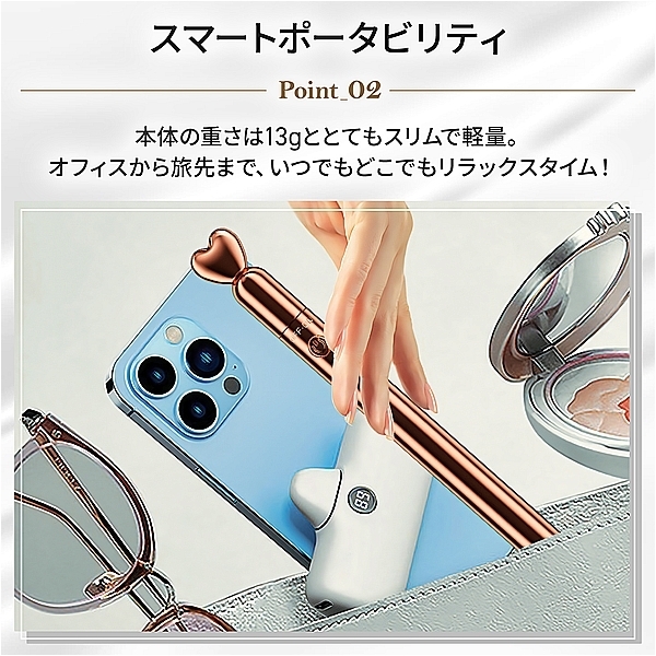携帯に便利な手のひらサイズのスタイリッシュなマッサージャーが登場!10種の振動パターンでご自身のライフスタイルに合わせて使い分け。ハート型のキャップがとても可愛く印象的。健康とリラクゼーションを目的としたフェムケア用品となり女性でも安心してご利用いただけます。※充電の際は、ハート部分(キャップ)を少しだけ反時計回りに回し引っ張ると、充電の差込口があります。●カラー:シルバー